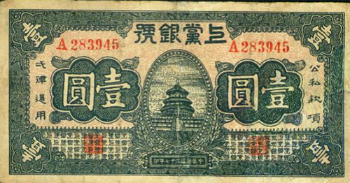 1938年,為了獨(dú)立自主地發(fā)展和鞏固根據(jù)地,嚴(yán)防蔣介石、閻錫山經(jīng)濟(jì)封鎖,晉東南抗日根據(jù)地在沁縣成立上黨銀號(hào),發(fā)行“上黨票”。上黨票初發(fā)行時(shí)與法幣、晉鈔、銀元以及根據(jù)地各縣銀號(hào)發(fā)行的縣票同時(shí)流通于晉東南、晉南、晉中、冀南等部分縣域,1938年發(fā)行的面額有拾元、伍元、貳元、壹元、伍角、貳角伍分、貳角、壹角等8種票面10種版別。壹元票的主圖設(shè)計(jì)為體現(xiàn)根據(jù)地貨幣特色,天壇主圖的下面倒印有一“黨”字暗記。1940年初,“上黨銀號(hào)”結(jié)束,其財(cái)產(chǎn)并入“冀南銀行”時(shí),共發(fā)行上黨票300余萬元。