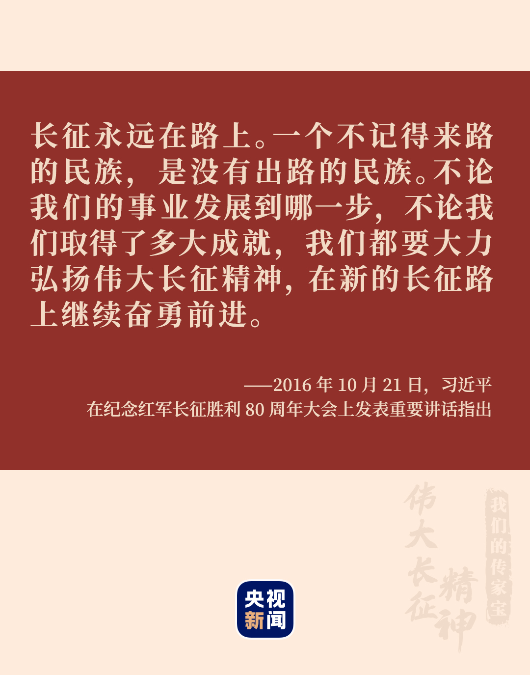 2016年10月,習(xí)近平總書記在紀(jì)念紅軍長(zhǎng)征勝利80周年大會(huì)上指出,震撼世界、彪炳史冊(cè)的長(zhǎng)征,宣告了國(guó)民黨反動(dòng)派消滅中國(guó)共產(chǎn)黨和紅軍的圖謀徹底失敗,宣告了中國(guó)共產(chǎn)黨和紅軍肩負(fù)著民族希望勝利實(shí)現(xiàn)了北上抗日的戰(zhàn)略轉(zhuǎn)移,實(shí)現(xiàn)了中國(guó)共產(chǎn)黨和中國(guó)革命事業(yè)從挫折走向勝利的偉大轉(zhuǎn)折,開啟了中國(guó)共產(chǎn)黨為實(shí)現(xiàn)民族獨(dú)立、人民解放而斗爭(zhēng)的新的偉大進(jìn)軍。