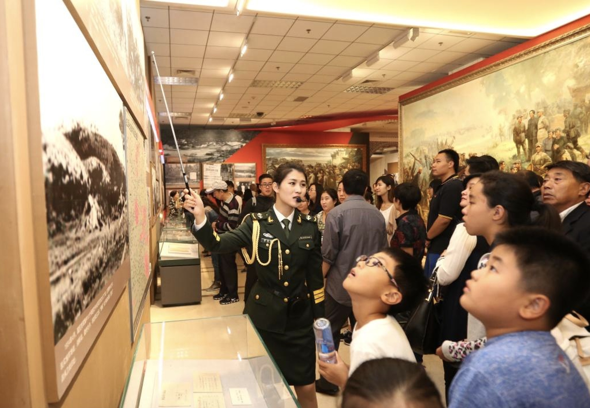 北京中國(guó)人民革命軍事博物館開放“英雄史詩(shī) 不朽豐碑——紀(jì)念中國(guó)工農(nóng)紅軍長(zhǎng)征勝利80周年主題展覽”,解說(shuō)員在為參觀者講解。